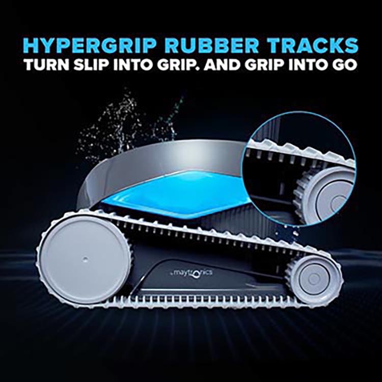 The Cayman is equipped with HyperGrip TM Rubber Tracks to ensure that no surface gets left behind. The tracks grip tightly to your pool’s floor and walls to eliminate the slipping that wheeled robots experience. With the Cayman, the debris and tough contaminants in your pool have nowhere to hide.