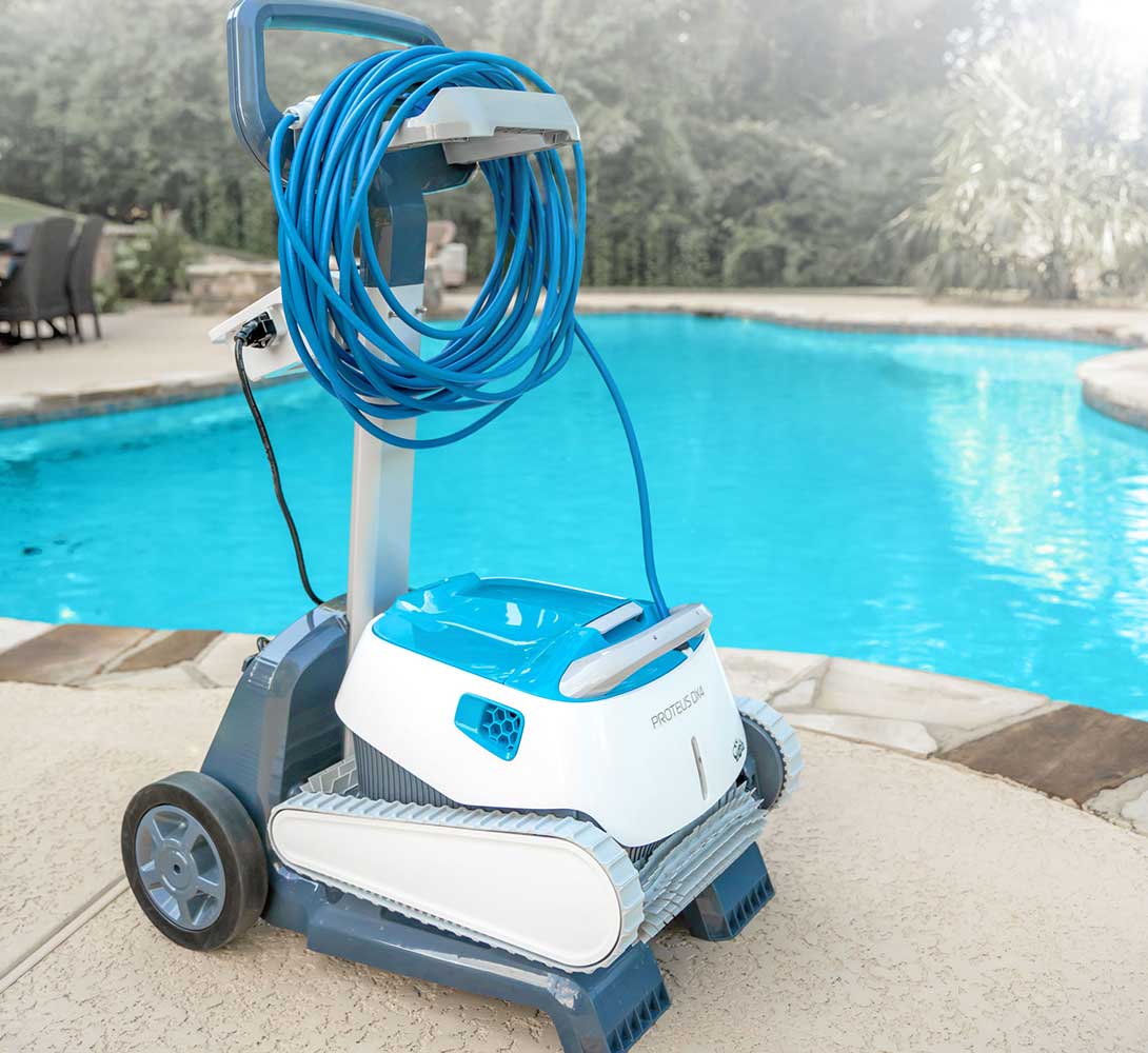 The Dolphin Proteus DX4 works as an automatic robotic pool cleaner. It will vacuum, scrub, and automate your pool cleaning. With a plug and play design, all you need is an outlet to plug it into and you’re good to go. No booster pump or assembly needed.