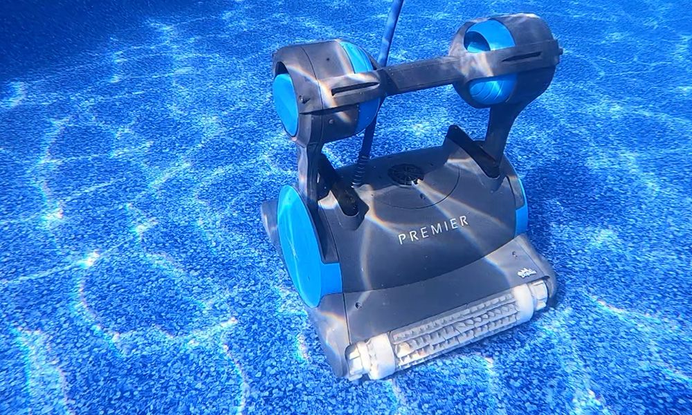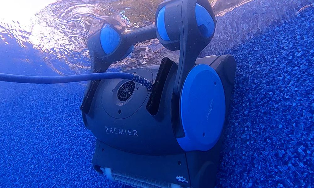 That way, it maximizes coverage and doesn’t waste time going over the same areas repeatedly. This, combined with dual stabilizers, gives the Premier precise control and positioning and makes it possible to adhere to the vertical pool surface up to the waterline and even slightly above the waterline. Watching the Premier in action, we were amazed at how it consistently seemed to defy gravity.